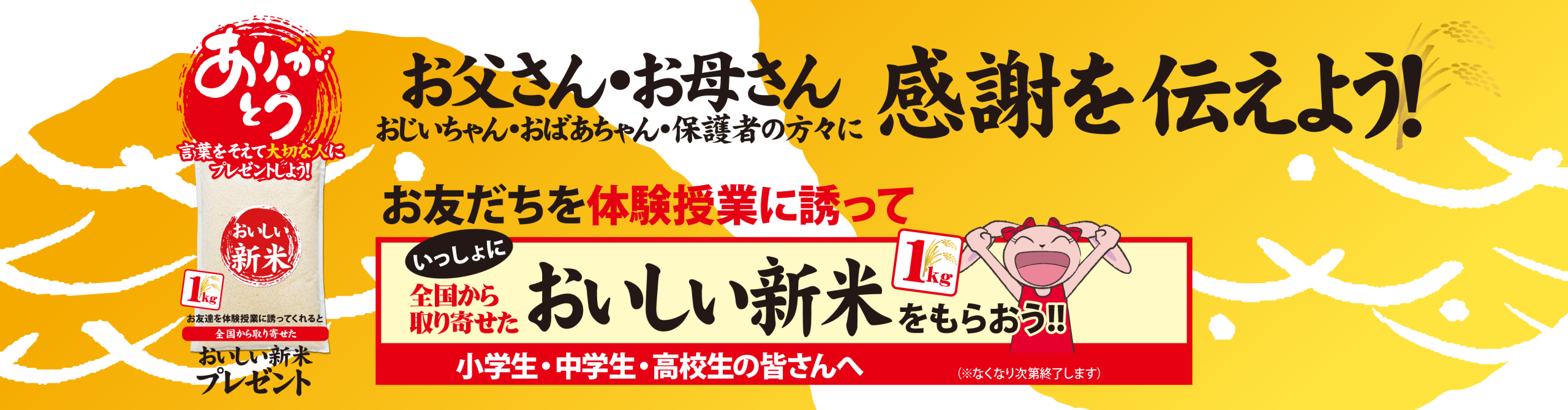 「お友だちを誘って、お米をもらっちゃおう」キャンペーンを今年も行います。
