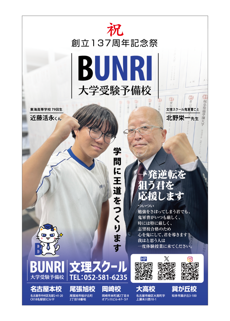 9月27日(土)・28日(日)に行われました『東海中学校・高等学校 創立137周年記念祭』の冊子に、文理スクールの北野塾長と東海高校79回生の近藤活永くんの写真とお知らせが掲載されました。